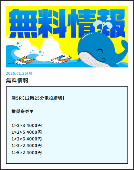 津競艇で今日1月26日(月)行われる競艇レースの無料予想を掲載しております。