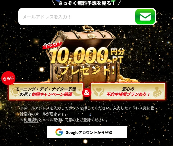 競艇トレジャーハンターはメールアドレス・Googleアカウント連携で登録できます。ただ、無料予想の利用にはLINE登録が必須なので、LINEアカウントもあると安心でしょう。