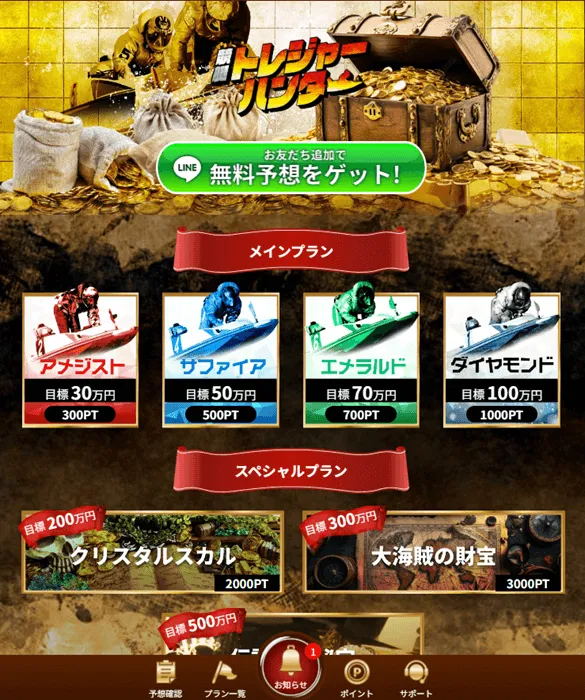 初回限定プランとして「モーニングハント」「デイハント」「ナイターハント」の3種類があり、いずれも予想が外れた場合は100PTが返還される。