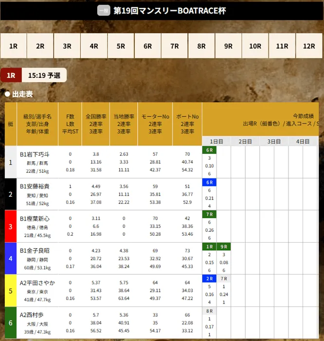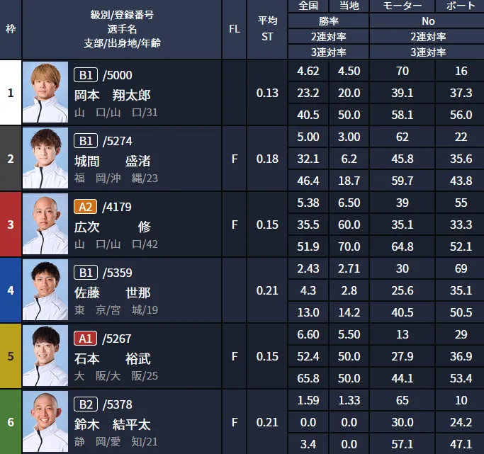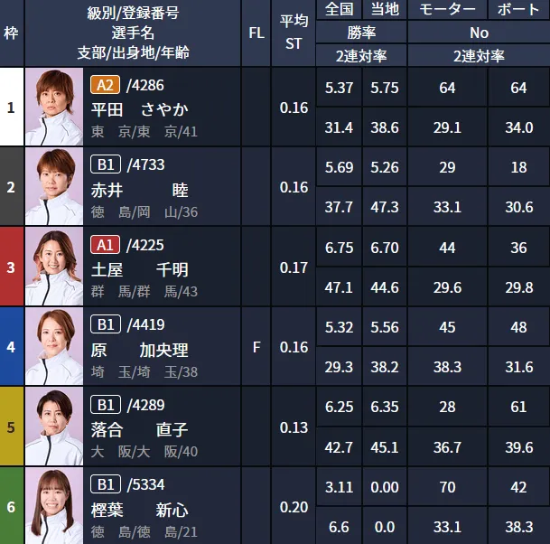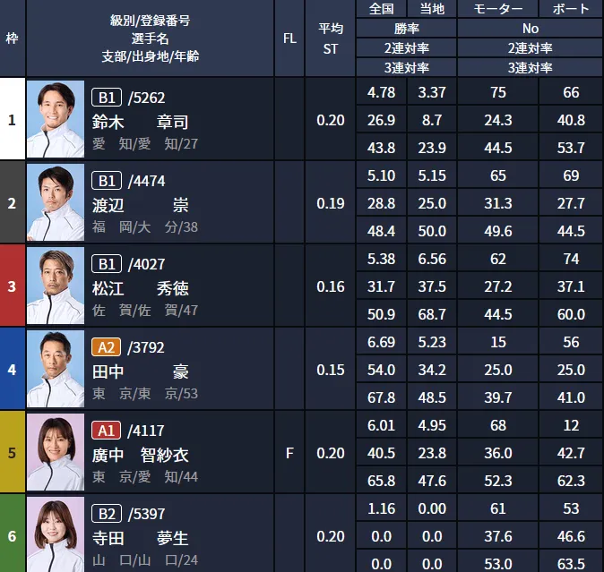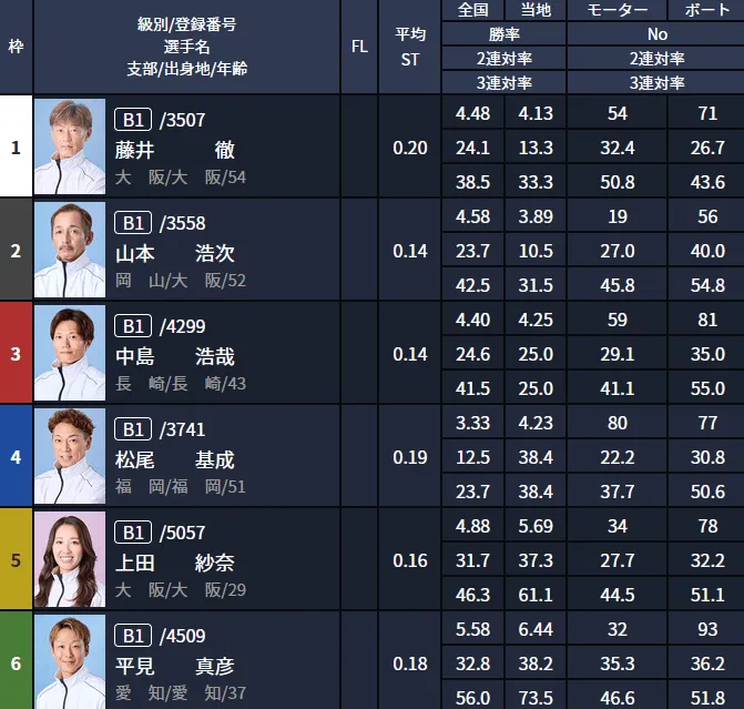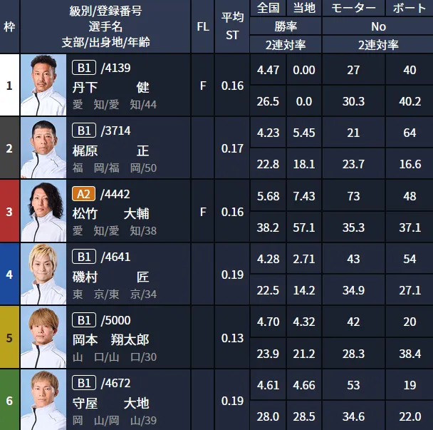 出走表を確認すると3号艇の松竹のみがA級で、残りは全員B1級・・・こういうレースは軸はわかりやすいのですが、2着・3着の予想が素人では難しいのですよね。
