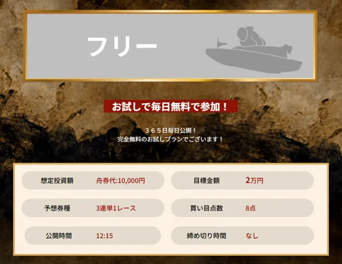 気を付けなければならないのは初回限定プランは単発2レースの予想であってコロガシではないこと・・・ですので、舟券代は2レース分用意しておかなければなりませんね。