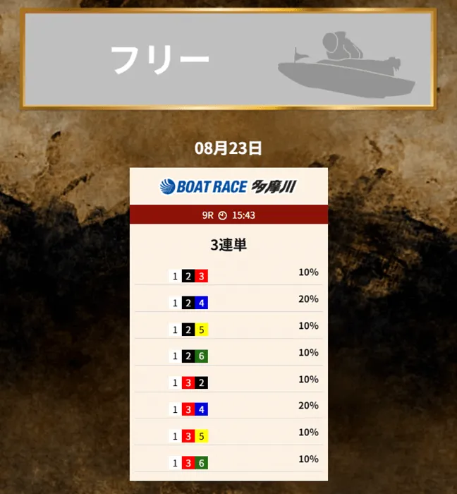 1日1回、年中無休で、きっちり12:15に公開される。3連単8点予想。