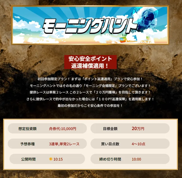 | モーニングハント | 3連単・単発2レース | 4~10点 | 10,000円 | 20万円 | 200PT | 初回限定プラン |