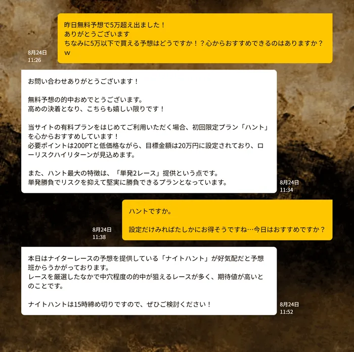 参加したのは2025年8月24日のナイトハントで、下関1Rと桐生7Rの買い目が届きました。