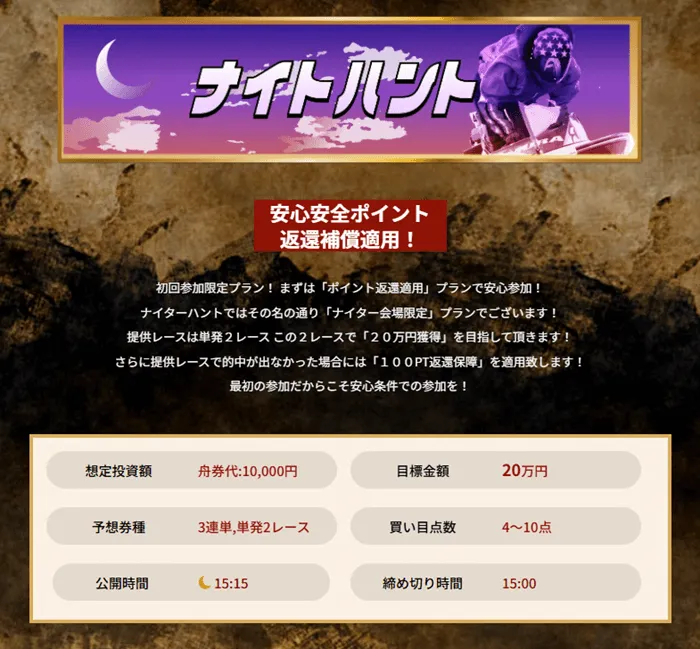 | ナイトハント | 3連単・単発2レース | 4~10点 | 10,000円 | 20万円 | 200PT | 初回限定プラン |