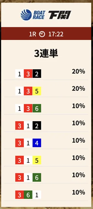 下関1Rの買い目はこちら・・・無料予想とは違ってオッズの低い「1-3-2」「1-3-5」が20%となっていますが、これはオッズを考慮したのか、それとも情報を考慮したのかわかりませんね。