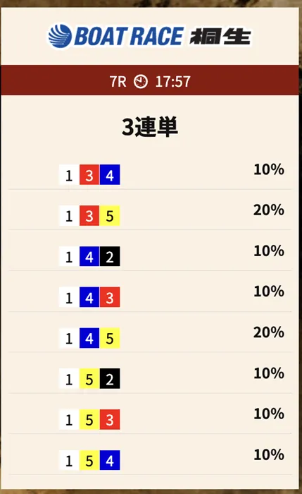 お次は桐生7Rで、買い目はこちら。今回もオッズの低い場所に厚く賭けるかと思いきや「1-3-5」「1-4-5」の2点が20%。