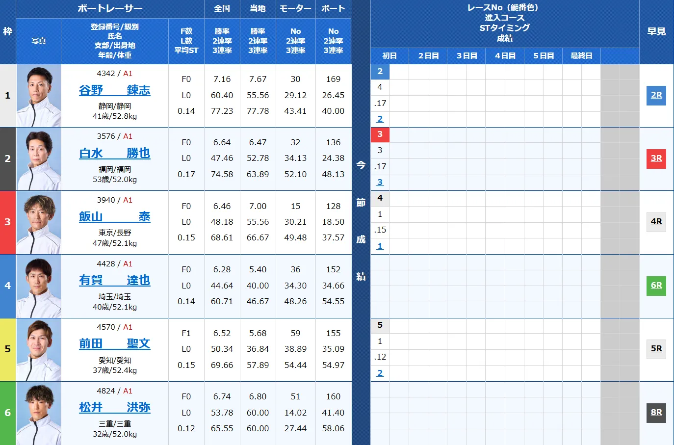 1号艇 谷野錬志・・ここは抜けた選手がおらず、枠有利に勝利を狙う!