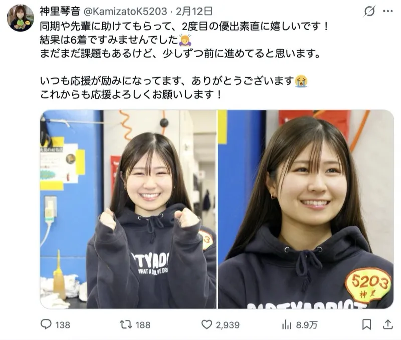 2026年2月12日に投稿されたのは、神里のかわいい笑顔の写真と一緒にレースで優出した時の内容。