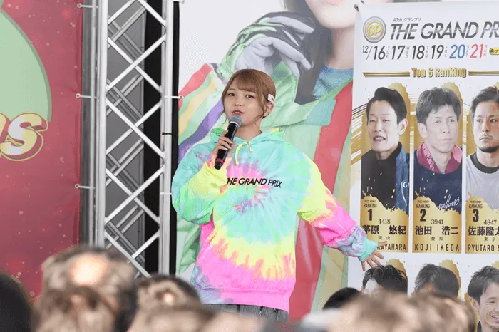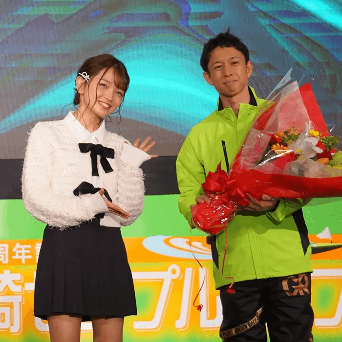 スマホケースをデコったり単勝舟券をお守り代わりに持ち歩いている福留ですが、じつは推しである毒島とは既に接触済み。イメージキャラクターを務めたG1尼崎センプルカップ2025のオープニングセレモニーにて、ドリームレースの出走選手にインタビューをしています。