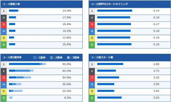 他コースだと2号艇・3号艇のコースが高くインコースが得意ということが読み取れますね。