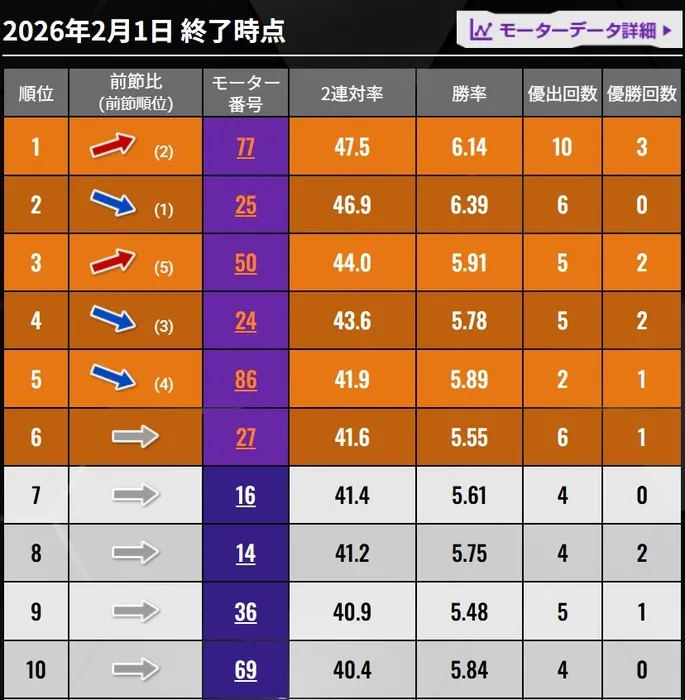 今回はモーター2連対率ベスト6、通称「オレンジモーター」を中心に紹介していきます!