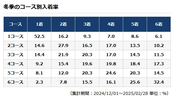 関東地区選手権が開催される冬季では、1コースの1着率が若干下がり2・3コースの勝率が上がるのが特徴です。それでも1コースの1着率が50%を超えることは事実ですが、安易に1号艇を軸にすると痛い目を見るでしょう。