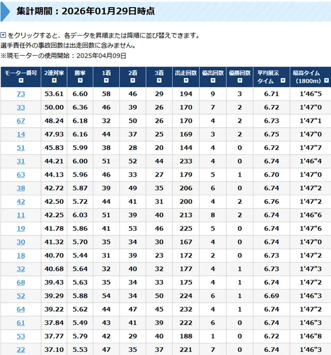 | モーター番号 | 2連対率 | 勝率 | 優出回数 | 優勝回数 |