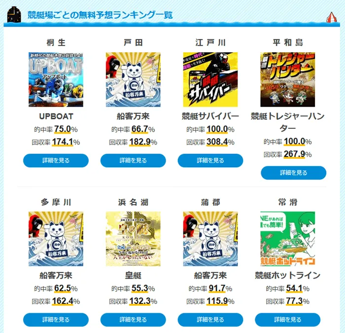 また「おすすめランキング」「クチコミランキング」「予想成績ランキング」など、各種ランキングも完備していますので、それぞれの強みを発揮しているサイトを発見することが容易。各競艇予想サイトは検証も行っていますので、気になった競艇予想サイトは登録前に検証レポートやクチコミを確認することをおすすめします。