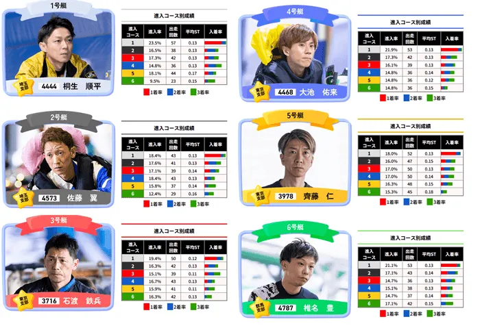 モーター抽選はまだなので全ての情報が出そろっている訳ではありませんが、初日12Rの予想をするのなら1号艇の桐生を軸にするのが良さそうですね。2号艇の佐藤、3号艇の石渡、4号艇の大池は、それぞれのコースでの2連対率が高いので、この3艇を買い目に入れておきましょう。
