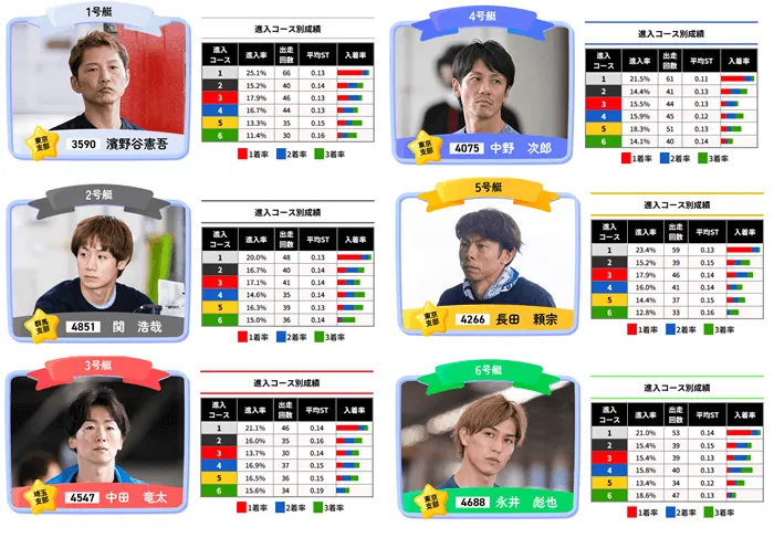 こちらもモーターの情報はないですが、現在入手可能な情報で予想をすると1号艇の濱野谷、2号艇の関を軸にするのが良さそうです。1・2号艇の競り合いになる可能性が高いので、3着には枠なりで進入した場合に3連対率が高い3・4・5号艇を入れておきましょう。
