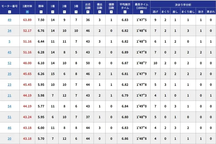 今回は、現時点での2連対率が高いモーターを中心に紹介していきます。入れ替え直後ということもあり、絶対的な数値ではありませんが、ひとつの目安としてチェックしておきましょう!