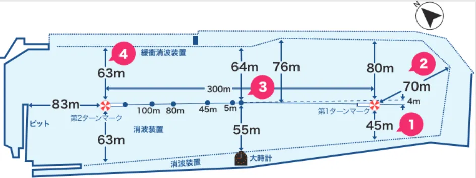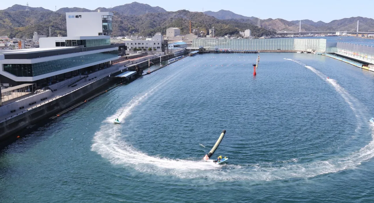 鳴門の水面は、スタートラインから1マークに向かって内側へと徐々に狭くなっていく形状が大きな特徴です。