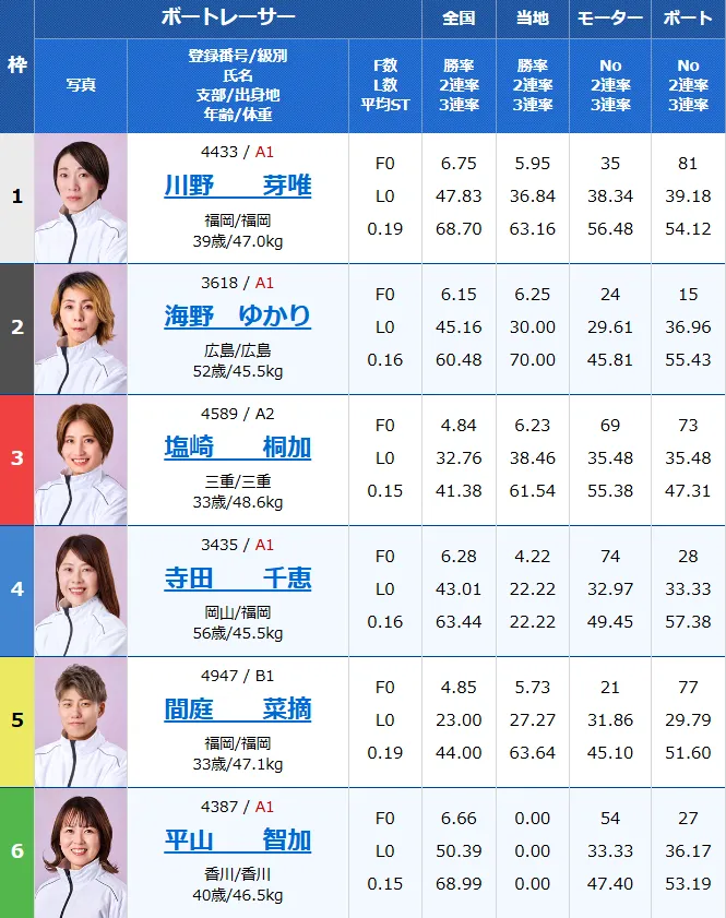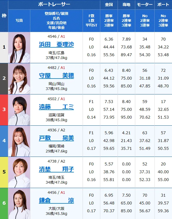 4~6号艇はA2・A1混合ですが、特に6号艇の鎌倉涼は実力もあり展開が向けば一発逆転も狙えるレーサー。ただ内側3艇の争いが激しくなる分、押し上げはやや厳しいかもしれません。
