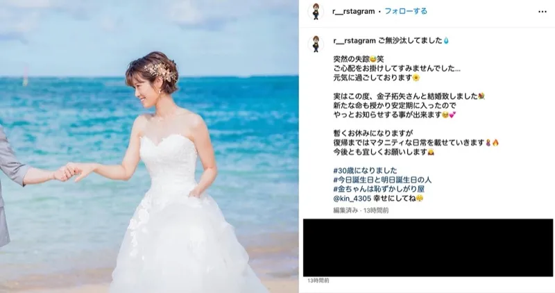「実はこの度、金子拓矢さんと結婚致しました。新たな命も授かり安定期に入ったのでやっとお知らせする事ができます」