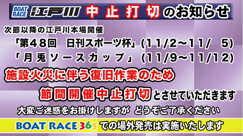 10月の火事の影響でボートレース江戸川で開催予定だった11月の2節の打ち切りが決定