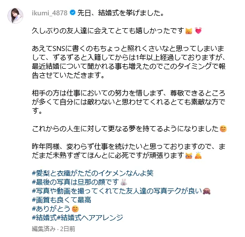 - 結婚相手は一般人のようだが幸せいっぱいそう