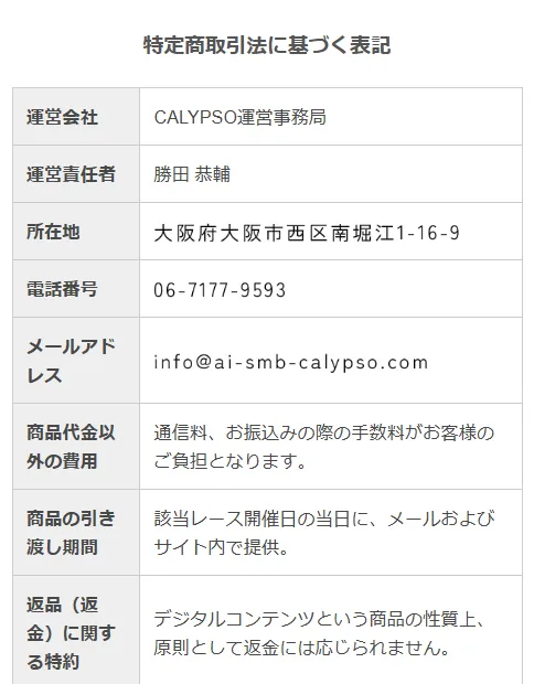 カリプソの運営元は「CALYPSO運営事務局」となっており、責任者名や所在地、電話番号やメールアドレスなど、基本的な運営者情報はしっかり公開されています。