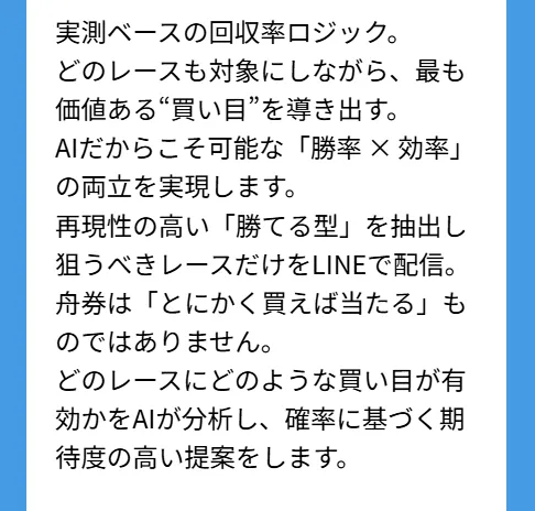 「再現性の高い勝てる型を見つけて提案する」「とにかく買えば当たる舟券ではない」という言い回しは、他の予想サイトと比べても強気な印象を受けます。