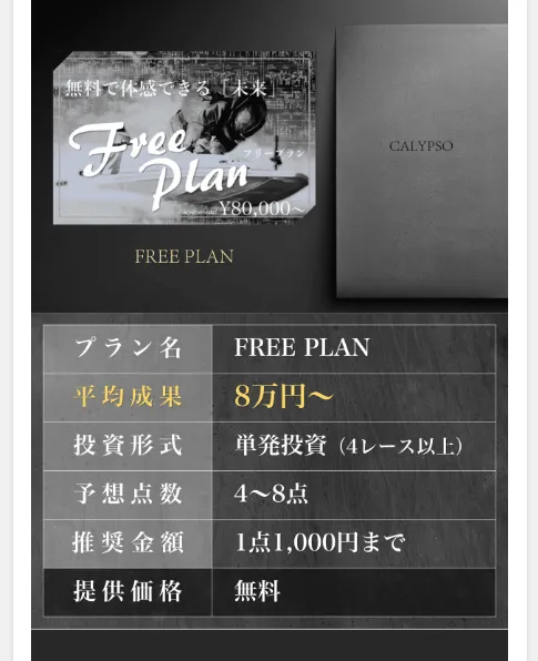 | プラン名 | 提供レース数 | 提供点数 | 推奨投資額 | 推定配当 | 提供価格 |