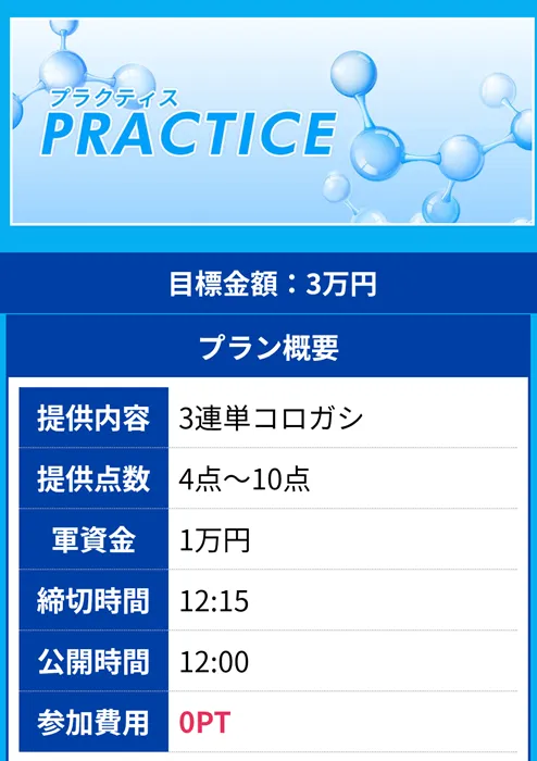 無料予想には実際に参加してみたものの、鉄板レースに鉄板予想で挑んでトリガミ!しかも1レース分しか予想を提供しないのに、プラン詳細では「コロガシ」と偽る嘘も発見しました。