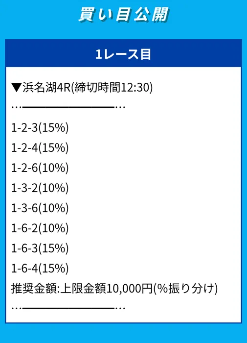 届いた買い目はガチガチの鉄板予想で、オッズが10倍に満たない買い目が半分も。ボートレースのオッズは他の公営競技に比べても低いものですが、ここまで低いとトリガミも心配です。