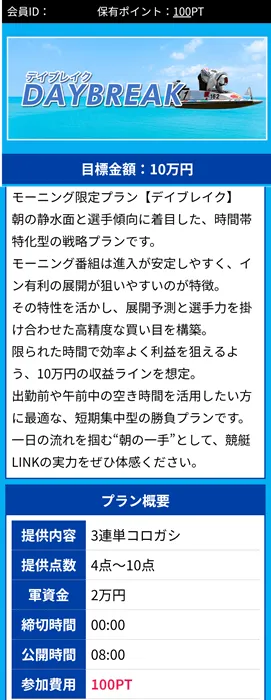 | DAY BREAK | 3連単コロガシ | 4点~10点 | 2万円 | 10万円 | 100PT | モーニング |