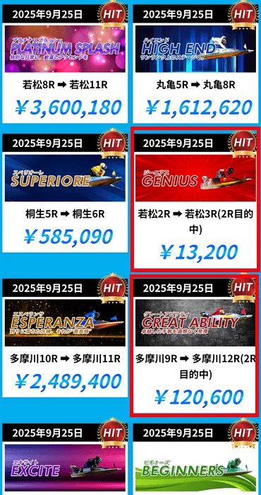 | GREAT ABILITY | 3連単コロガシ | 4点~10点 | 2万円 | 200万円 | 2000PT | デイ |
