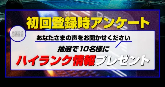 初回登録後、会員ページからアンケートに回答すると、抽選で10名にハイランク情報が当たるキャンペーンも実施されているようです。