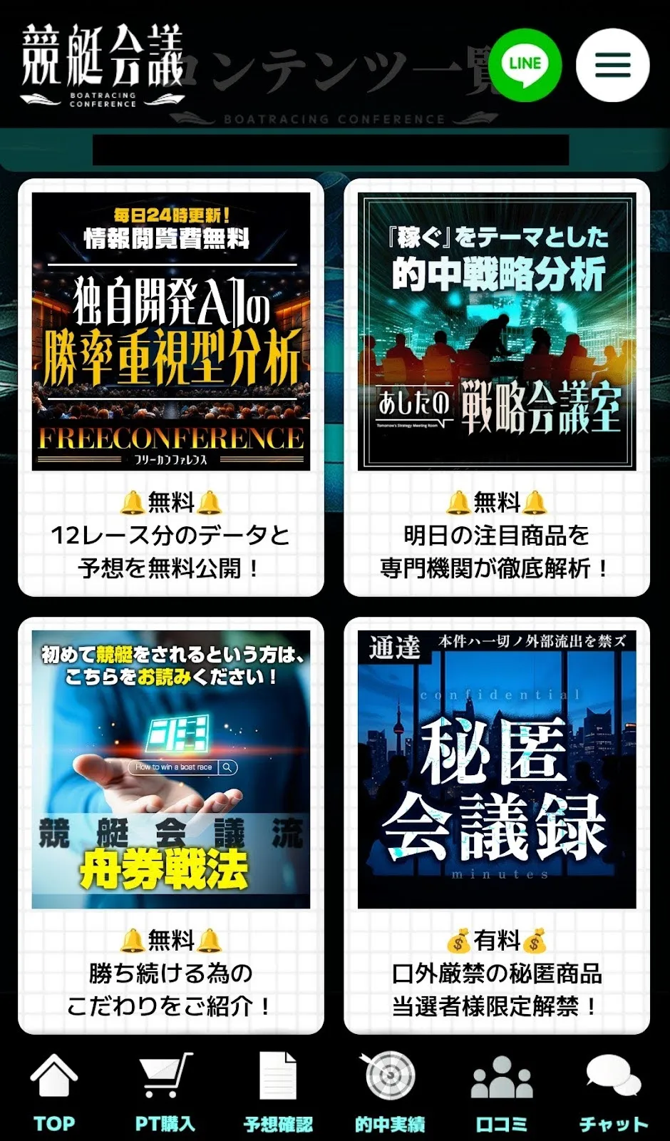 「競艇会議」の無料予想は毎日0時に公開される。特筆すべきは予想は3連複であることと、1会場にしぼって12レース全予想ということだ。提供数だけで見れば競艇予想サイト最多である。ここは評価して良いだろう。