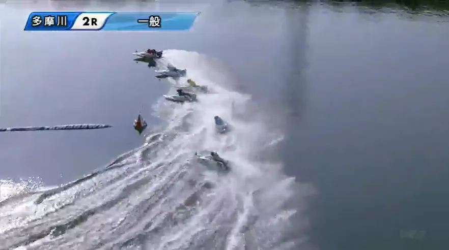 多摩川2R、レースがスタートし、1周目の第1ターンマークへ。
