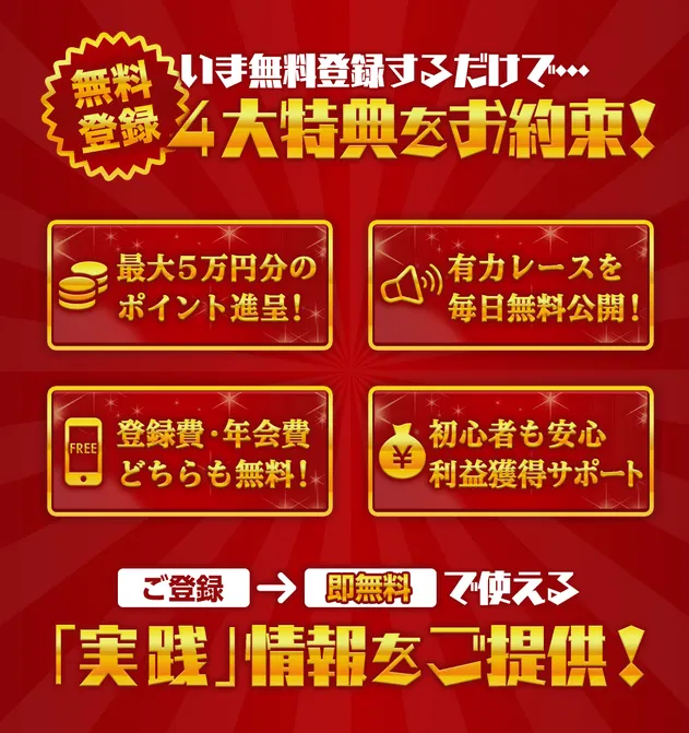 さっそく会員登録ページをチェックしていくのですが、トップ画像の下には「4大特典をお約束!」の文字が。