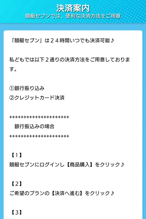 こちらのサイトでは有料予想は直接決済制を採用しているようで、プラン選択後に支払方法を選択するなど、やり方がずらずらと並んでいます。