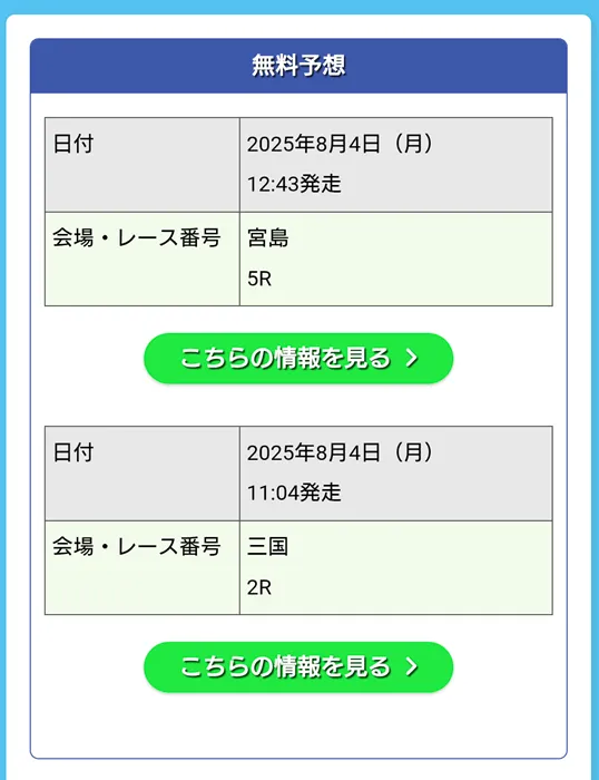 「こちらの情報を見る」のボタンをタップすると即座に買い目が表示される仕様なので、無料予想の詳細はわかりませんが、参加した印象ではこのようになっているようです。