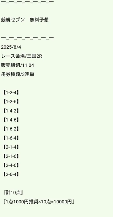 さて、ここからは無料予想に実際に参加するターンですが、参加したのは2025年8月4日で1レース目は三国2Rです。