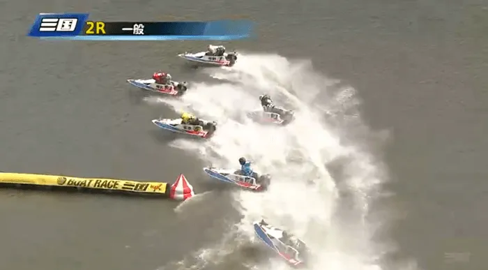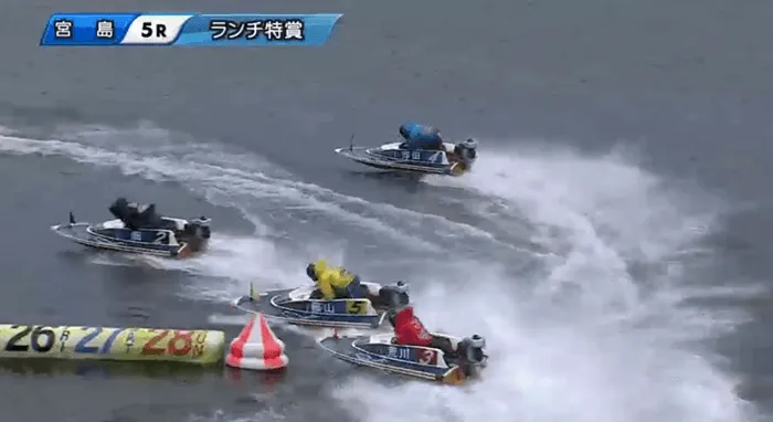 1周目1Mでは4号艇の浮田が「まくり」を狙って動いたので、その影響で1・2・4号艇が若干流れて、3・5号艇がインコースをつきました。