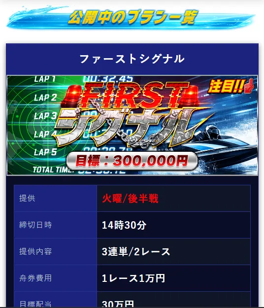 | ファーストシグナル | 3連単2レース | 1レース1万円 | 30万円 | 300PT |