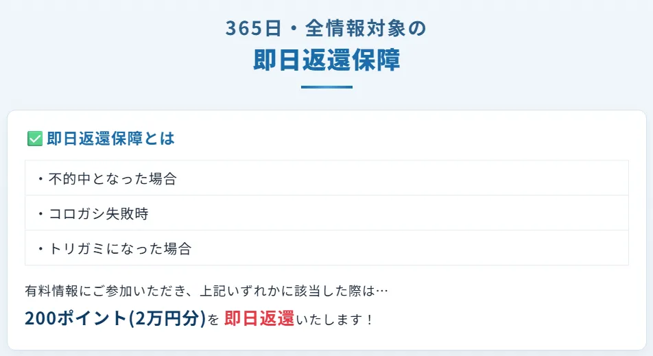 内容を見ると、有料情報に参加して「不的中」「コロガシ失敗」「トリガミ」のいずれかに該当した場合、200ポイント(2万円分)が即日返還されるとのこと。