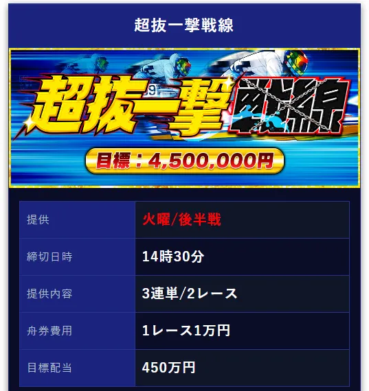| 超抜一撃戦線 | 3連単2レース | 1レース1万円 | 450万円 | 3,000PT |