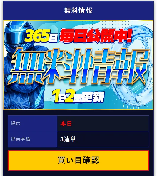 無料予想は毎日2レース。10時頃と15時頃に公開される。3連単予想だが、目標金額・舟券代の指定はない。
