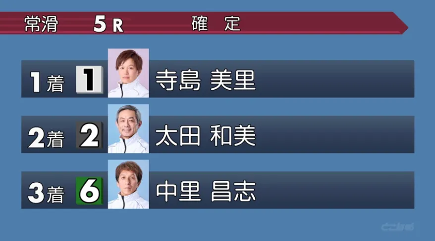 後続では2号艇・太田が2着、6号艇・中里が3着に入り、そのままゴールとなりました。
