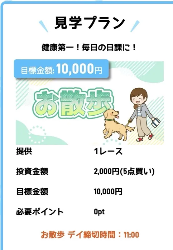 | プラン名 | 提供レース | 提供券種 | 必要ポイント | 目標金額 |