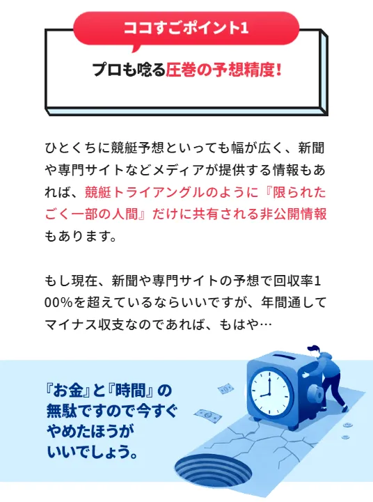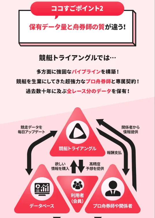 「競艇トライアングル」の強みは保有データ量と舟券師の質が違うとのこと。他にもサイトのアピールが細かくされており、印象としては悪くない。
