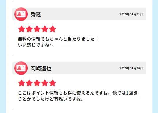 登録・利用上の問題はありませんが、ここまであからさまなサクラレビューは見逃せません。基本的に信用しないほうが良いでしょう。